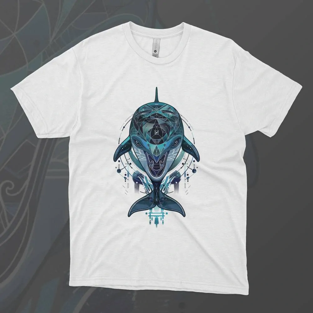 Nebeský delfín je symbolem radosti a duchovního propojení s oceánem. Toto tričko vypráví příběh delfína, který byl poslem mezi světem lidí a mořskými hlubinami. Delfín vedl starodávné námořníky bezpečně přes rozbouřené vody a předával jim moudrost mořských bohů. Když si obléknete toto triko, pocítíte radost a svobodu, které delfín přináší. Geometrické tvary na tričku podtrhují jeho ladnost a inteligenci. Tričko je nejen stylové, ale také přináší ducha ochrany a radosti nebeského delfína.
