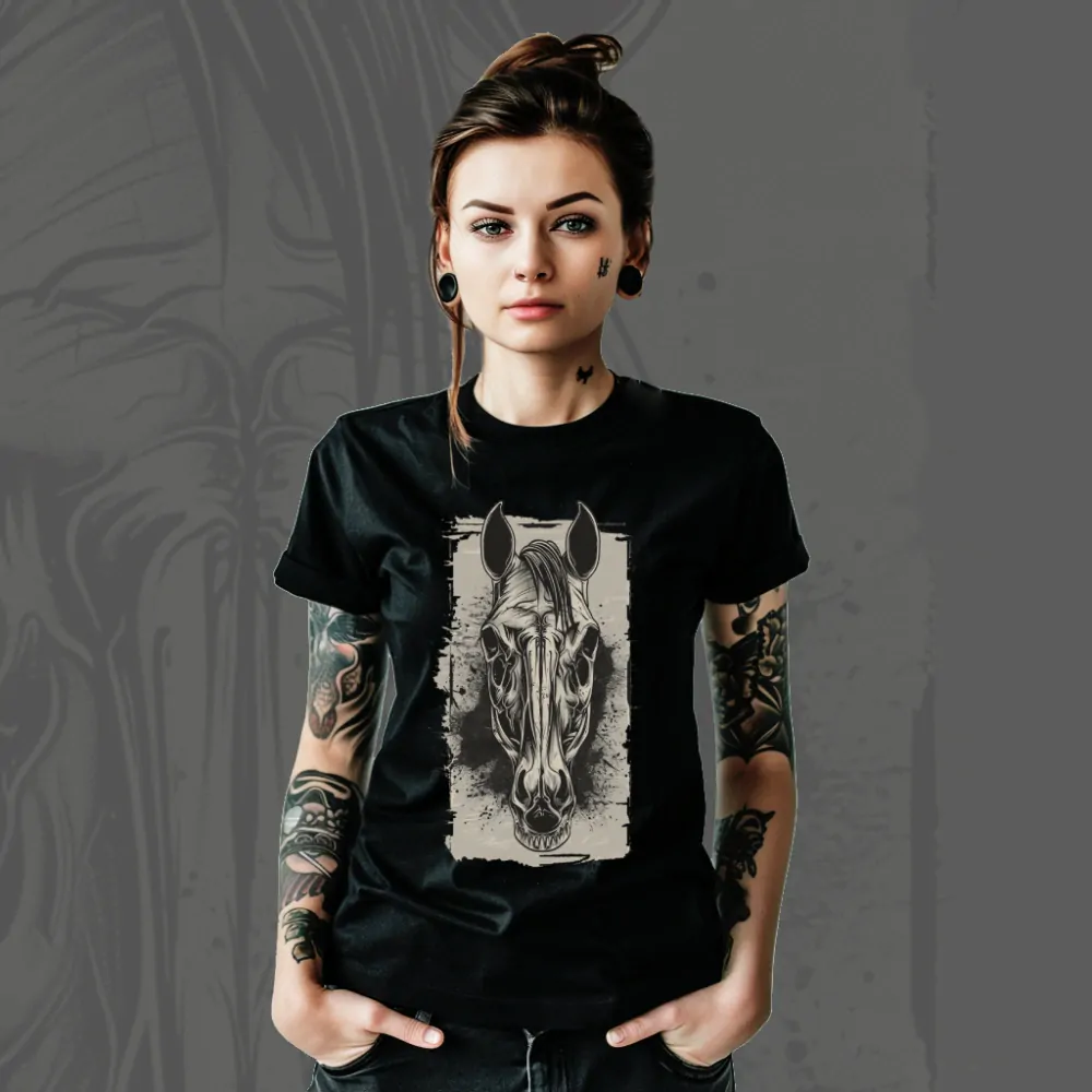 Zamilujte se do této symfonie hrůzy a mystiky s tričkem Dark Horse Skeleton. Představte si osedlaného koně ze záhrobí, jehož kostra pulzuje energií z temných rohů podsvětí a jehož oči svítí jako ohnivé uhlíky v nočním šeru. Výrazná lebka koně vytváří temný a mystický motiv inspirovaný symbolikou smrt a divokou silou přírody. Tento design spojuje motiv kůň, lebka a temná atmosféra, která připomíná legendy o duchu koně a pomíjivosti života.