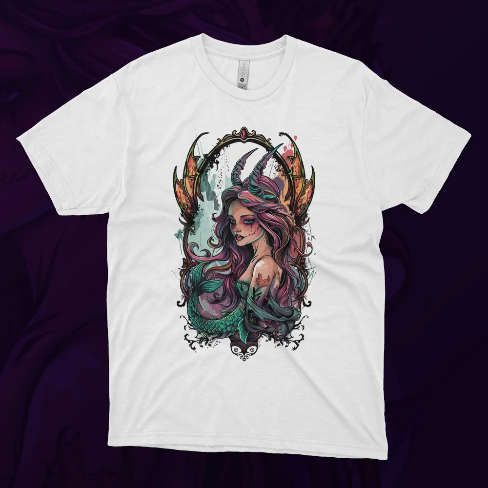 Co se skrývá v hlubinách temného oceánu? Zde se probouzí temná mořská panna, vládkyně podmořské říše, která láká nevinné duše do svých náručí. Toto tričko vás zavede na cestu do podvodního světa, kde se stýká krása a hrůza, a kde zpívá Dark Mermaid své záhadné písně. Připraveni se ponořit do podmořského tajemství?