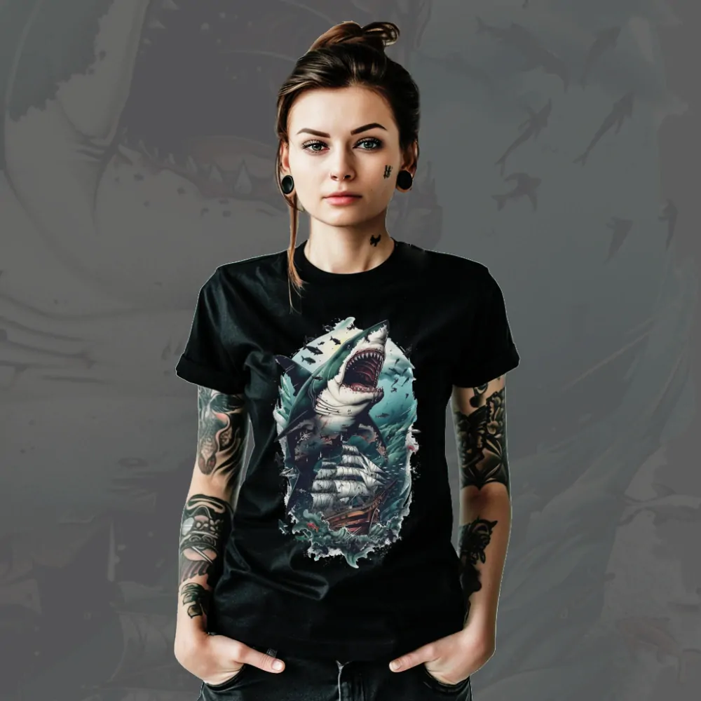 Temním hlubinám oceánu kraluje Giant Shark, jehož hrozivá přítomnost vyvolává úctu i hrůzu mezi mořeplavci. Oblečte se do tohoto trička a vydejte se na nebezpečnou výpravu do světa, kde se střetávají síla a děs, kde Giant Shark pohlcuje veškerou naději a zanechává za sebou jen stopu zkázy a hrůzy.