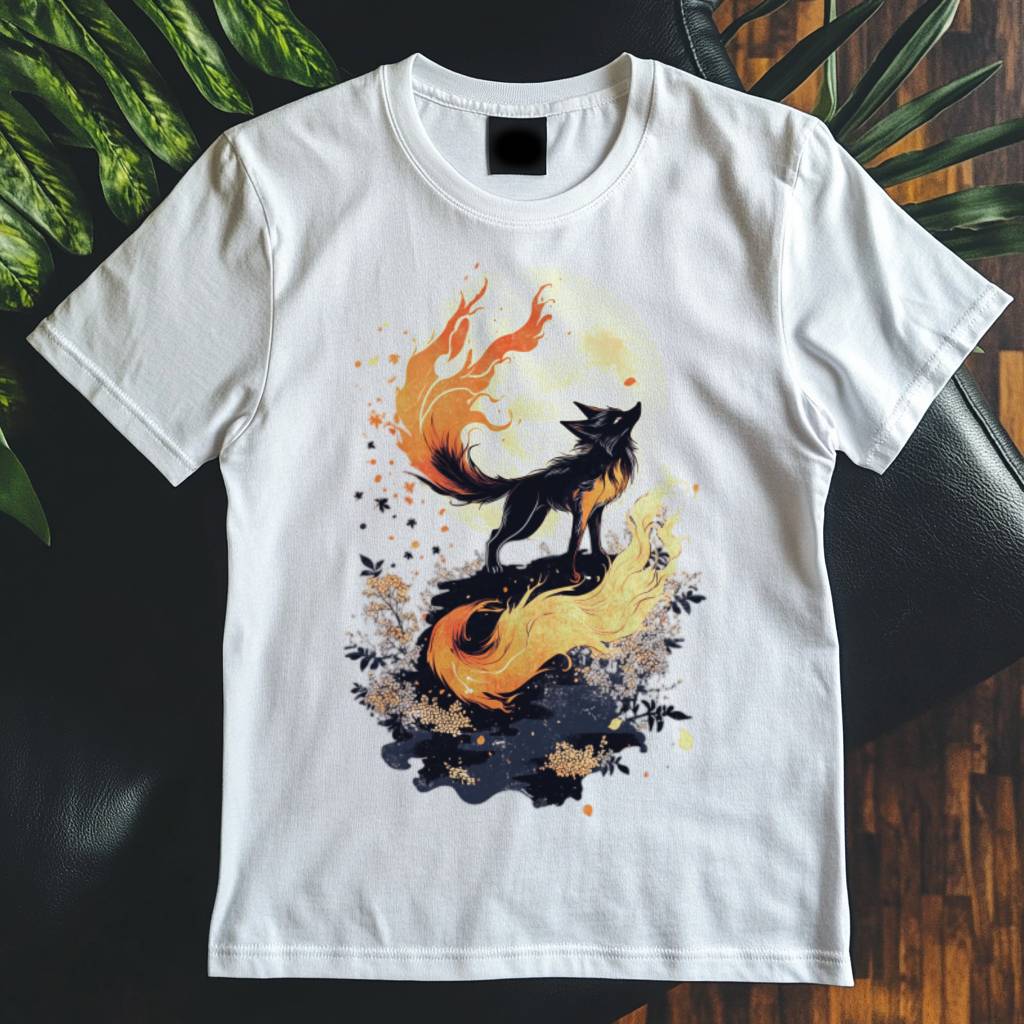 Detailní kresba zdůrazňuje kontrast mezi klidem lišky a chaosem ohně, což dělá z motivu silné anime tričko.