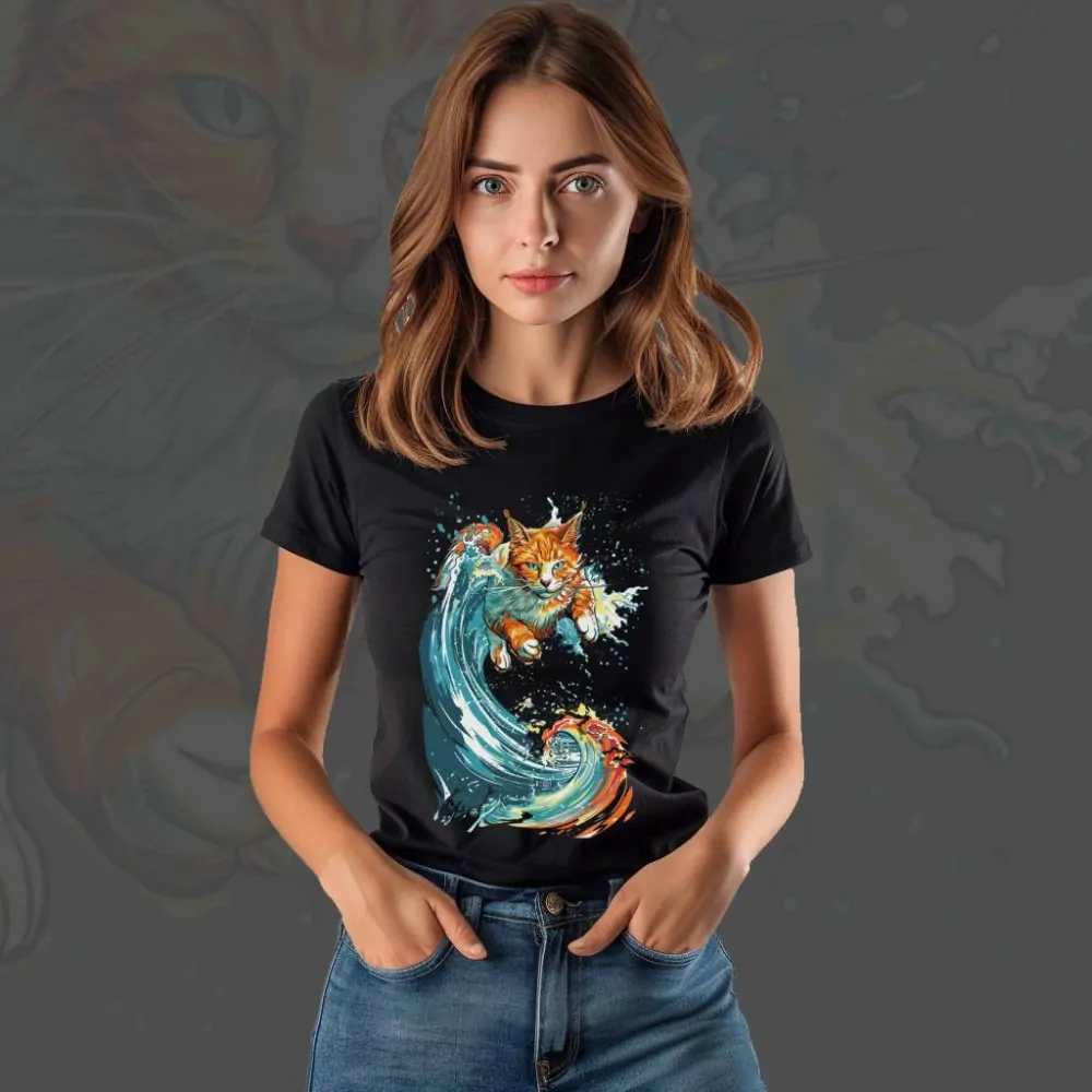 Představujeme vám tričko s názvem Oceánská kočka, které zachycuje kočku stojící před mohutnou mořskou vlnou. Tato odvážná kočka se nebojí vody a s hrdostí čelí vlnám, které se lámou na pobřeží. Představte si, jak Oceánská kočka prozkoumává pláže, hraje si s mořskými tvory a užívá si osvěžujícího mořského vánku. Toto triko je ideální pro všechny milovníky koček, kteří mají rádi moře a dobrodružství. Přidejte do svého šatníku tento jedinečný kousek a nechte se unést atmosférou oceánu s touto nebojácnou kočičí přítelkyní.