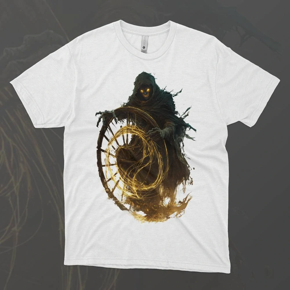 Rumpelstiltskin – Zlatá Past zachycuje moment, kdy jsou zlaté nitky pavučiny osudu napjaté na maximum. Tento design symbolizuje nebezpečí, které se skrývá za lákavou nabídkou, kterou Rumpelstiltskin nabízí. Zlaté detaily na tričku připomínají přitažlivost bohatství, zatímco tajemné stíny a temné linie naznačují, jak snadno se lze nechat lapit do pasti jeho kouzelné moci. Tričko je vyjádřením hrozby, která přichází s touhou po zlatě, a upozorňuje na nebezpečí, které číhá v každém slibu, který zní příliš dobře, než aby byl pravdivý.
