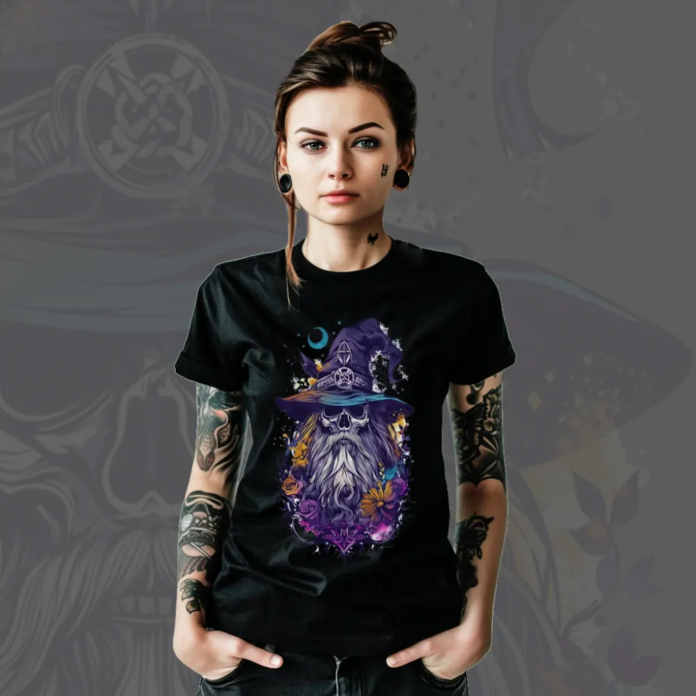 Pod stínem zapomenutého cirkusu leží tajemný The Dead Magician, jehož oči zrcadlí proměnlivé odlesky plamínků svíček. Jeho ruce, kdysi schopné vyvolat zázraky, teď spočívají v klidu, zatímco jeho mysl stále tápe mezi světy. Toto tričko je bránou do světa, kde se setkávají mystika a melancholie, kde The Dead Magician pozoruje divadlo života a smrti s pochmurnou rezignací. Oblečte se do této zbroje a připravte se na cestu za hranice realitu a iluze, kde každý krok je krokem do zapomnění a návratem k prapůvodním zdrojům magie. Temný motiv, kde lebka připomíná postavu, jakou by mohl být tajemný čaroděj nebo mocný kouzelník, vytváří mystickou atmosféru plnou magie a starých legend. Tento design propojuje symbol smrt, temné kouzlo a fantasy svět plný čarodějů a kouzelníků.