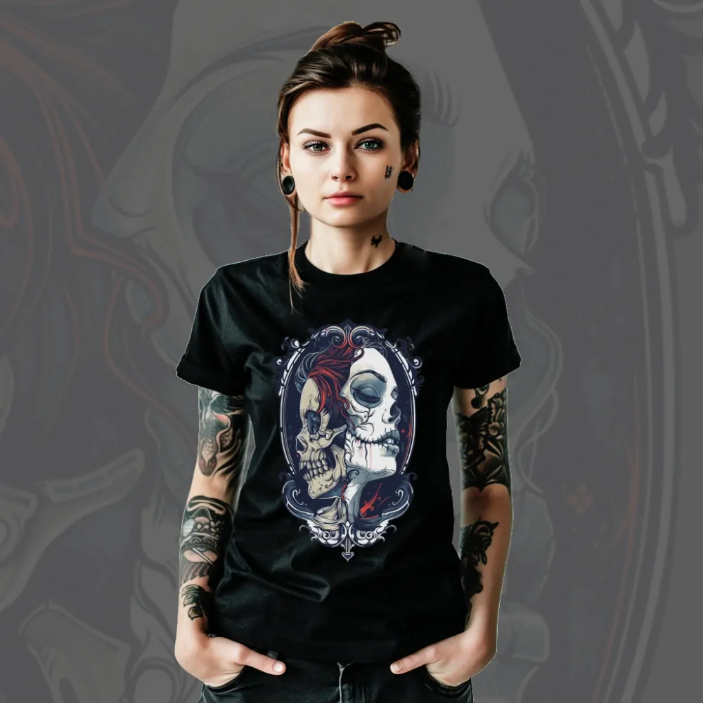 Uprostřed stínů hřbitova se nacházejí The Two Faces of Death, jejichž přítomnost vyvolává chlad a ticho v srdci každého, kdo se k nim přiblíží. Jedna tvář vyjadřuje konec - smrtka, druhá nový začátek, a obě spolu tvoří symfonii nevyhnutelnosti. Toto tričko je vstupenkou do světa, kde se setkávají světlo a temnota, naděje a zoufalství. Oblečte se do této zbroje a připravte se na cestu za hranice lidského chápání, kde The Two Faces of Death provází každého svým tajemným tanec. Temný motiv, kde se propojuje lebka a tajemná žena, symbolizující křehkou hranici mezi životem a smrtí. Ilustrace připomíná tichou přítomnost smrtky, která doprovází lidský osud a dodává designu mystickou a lehce gotickou atmosféru.
