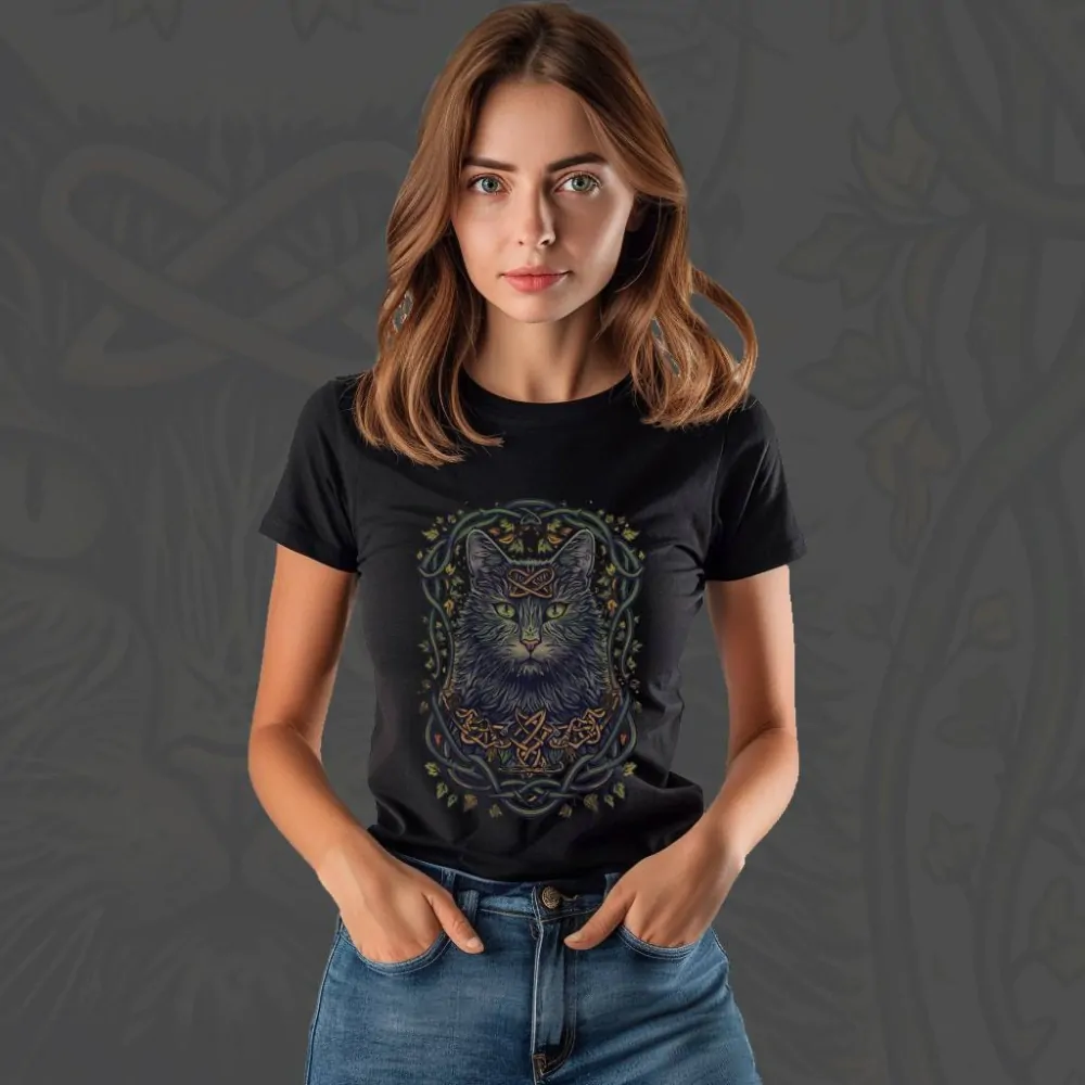 Představujeme vám tričko s názvem Vikingská kočka, které zachycuje odvážnou černou kočku ve stylu vikingského válečníka. Tato impozantní kočka, s očima plnýma odhodlání a hřívy na znamení síly, je připravena na dobrodružství a boj. Nosí vikingskou helmu a brnění, které jí dodává vzhled statečného bojovníka z dávných dob. Představte si, jak Vikingská kočka stojí na palubě vikingské lodi, připravená plout do neznáma, její hříva vlaje ve větru a v očích se zračí touha po dobytí nových světů. Toto triko je ideální pro všechny milovníky koček a vikingské historie, kteří chtějí do svého šatníku přidat kousek plný síly, odvahy a historického ducha. Přidejte si tento jedinečný kousek do svého šatníku a nechte se unést dobyvačným duchem vikingských dobrodružství s touto majestátní kočkou válečnicí.