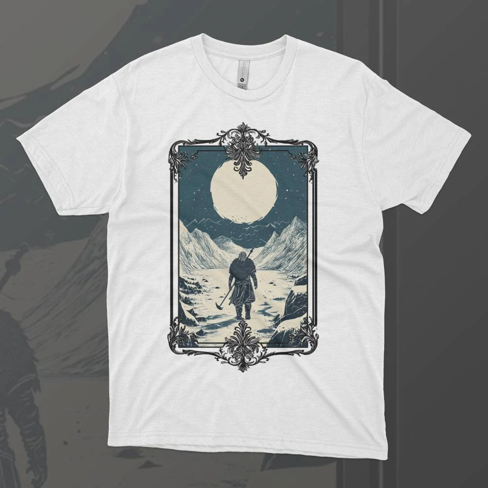Viking na mrazivém Severu zobrazuje nezdolného válečníka, čelícího drsným podmínkám ledového kraje. Postava vikinga, zahalená do těžkého kožešinového pláště, stojí proti větru, zatímco za ním se tyčí zasněžené hory a zamrzlá krajina. V ruce pevně svírá svou sekeru, která je připravena bránit jeho čest i život. Chladné tóny motivu zachycují nelítostnou krásu severu a vytrvalost těch, kteří zde přežívají. Tento design odráží odvahu, sílu a odhodlání, které jsou nedílnou součástí vikingského ducha.