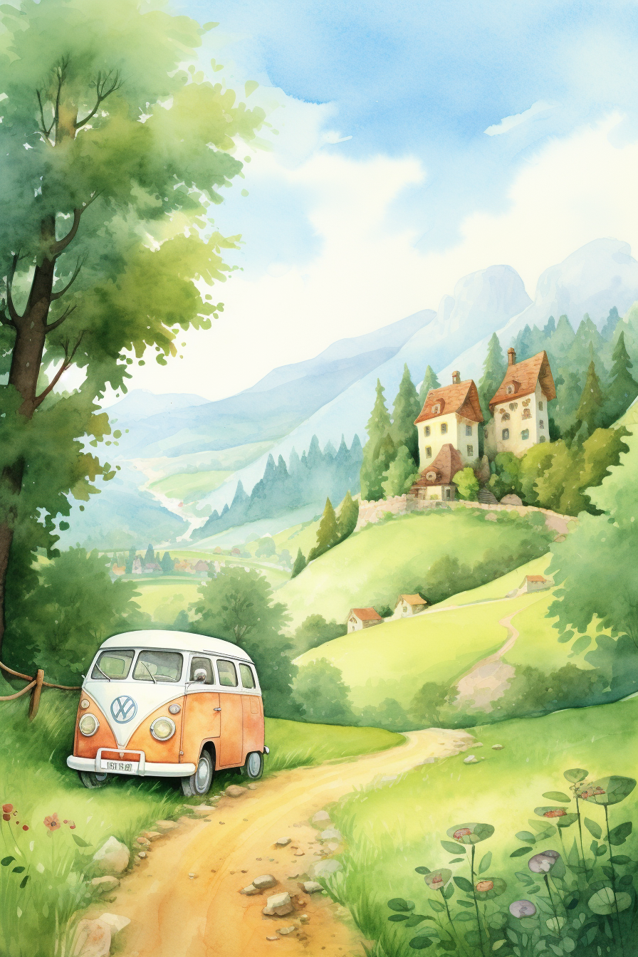 Na malovaném obraze se nachází kopcovitá krajina s dvěma majestátními věžemi vyčnívajícími na vrcholu kopce. Skrze malebné krajiny vede jasně vymezená cesta, která směřuje k těmto věžím a pozve diváka na dobrodružnou cestu. V popředí obrazu se nachází malý barevný autobus, který přináší živost a pohyb do klidné scenérie.