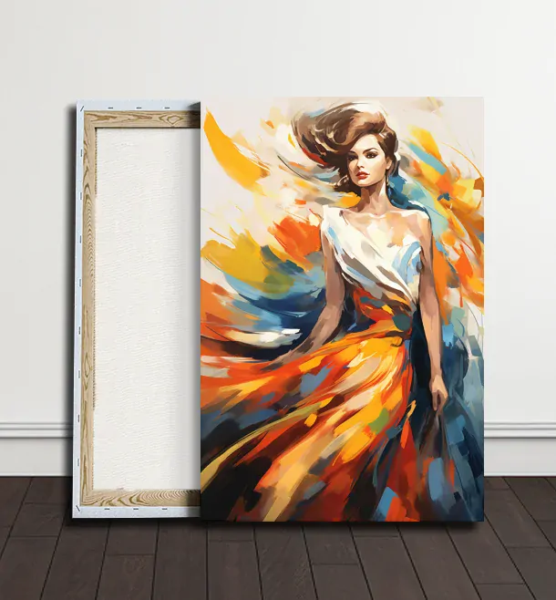 Obraz ukazuje ženu v bílých šatech s barevnými detaily, které se slévají s pozadím. Pozadí je složeno z oranžových, žlutých a modrých barev, které vytvářejí dojem pohybu a energie. Ženin účes je jednoduchý a elegantní. Obličej ženy je rozmazaný, aby se respektovala její identita. Tento obraz je skvělý pro ty, kteří chtějí přidat trochu života a optimismu do svého prostoru.