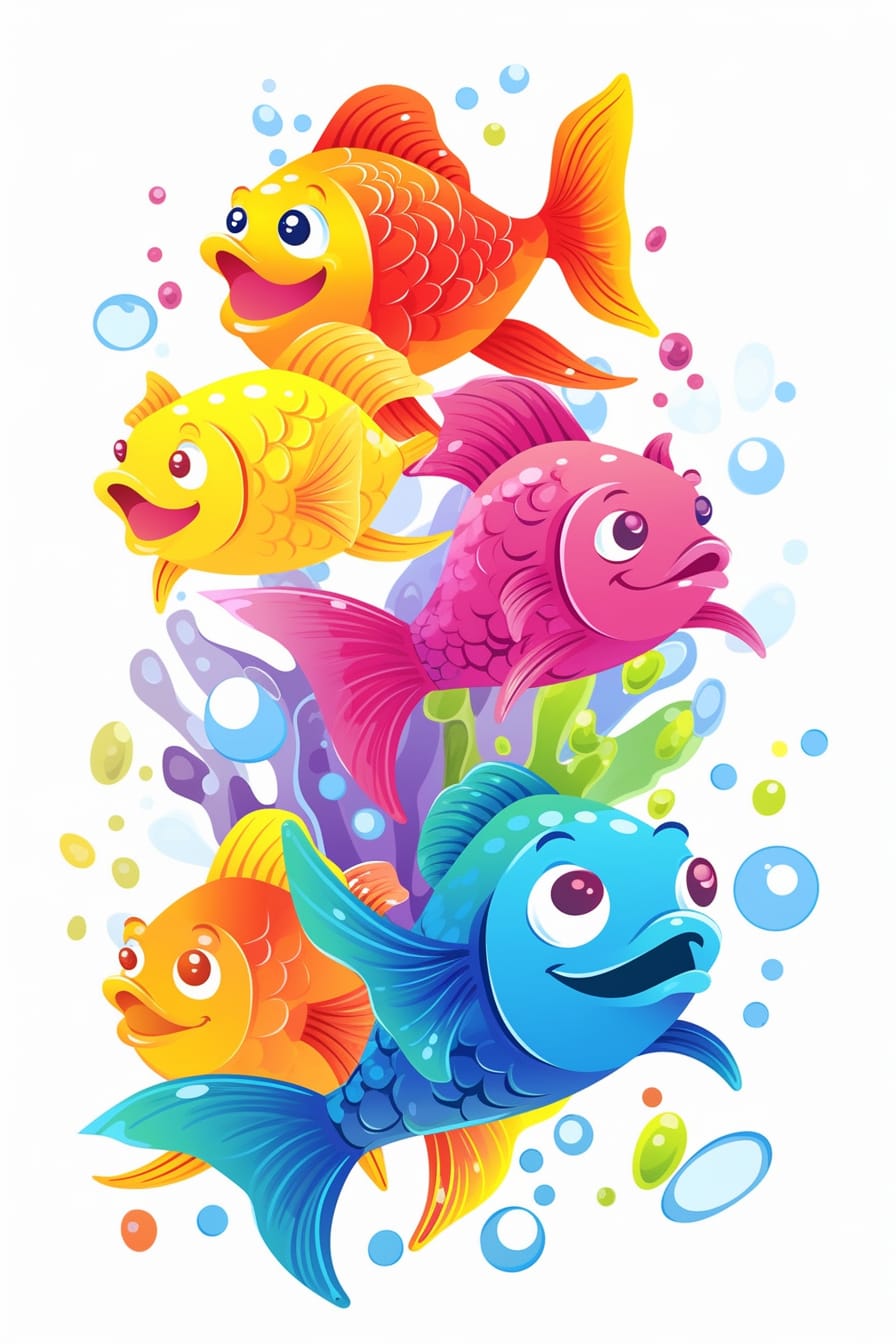 Pět barevných ryb se elegantně pohybuje na bílém pozadí, zatímco voda a hravé bublinky vytvářejí magický a radostný scénický doprovod.