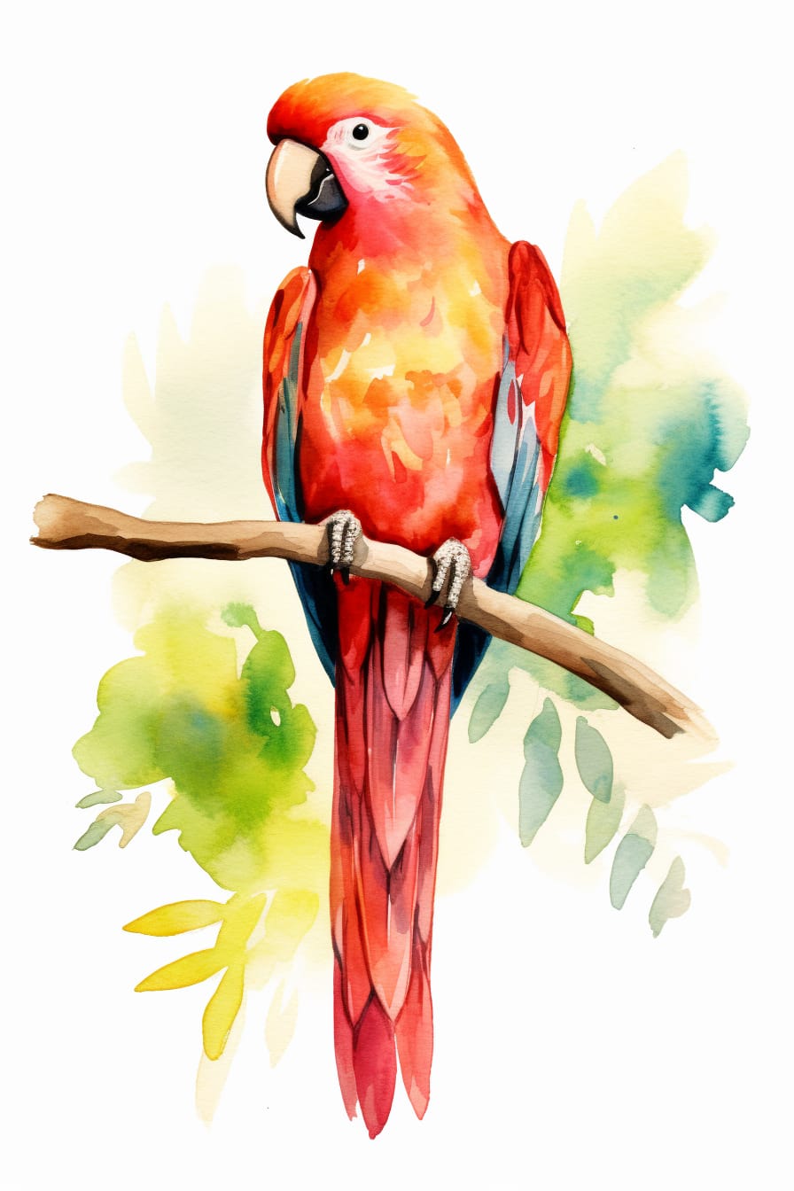 Na tomto poutavém kresleném obraze usedá červený papoušek s jasným opeřením na větev. V pozadí se rozprostírá pestré a živé barevné pozadí, které dodává celému obrazu pocit radosti a života.