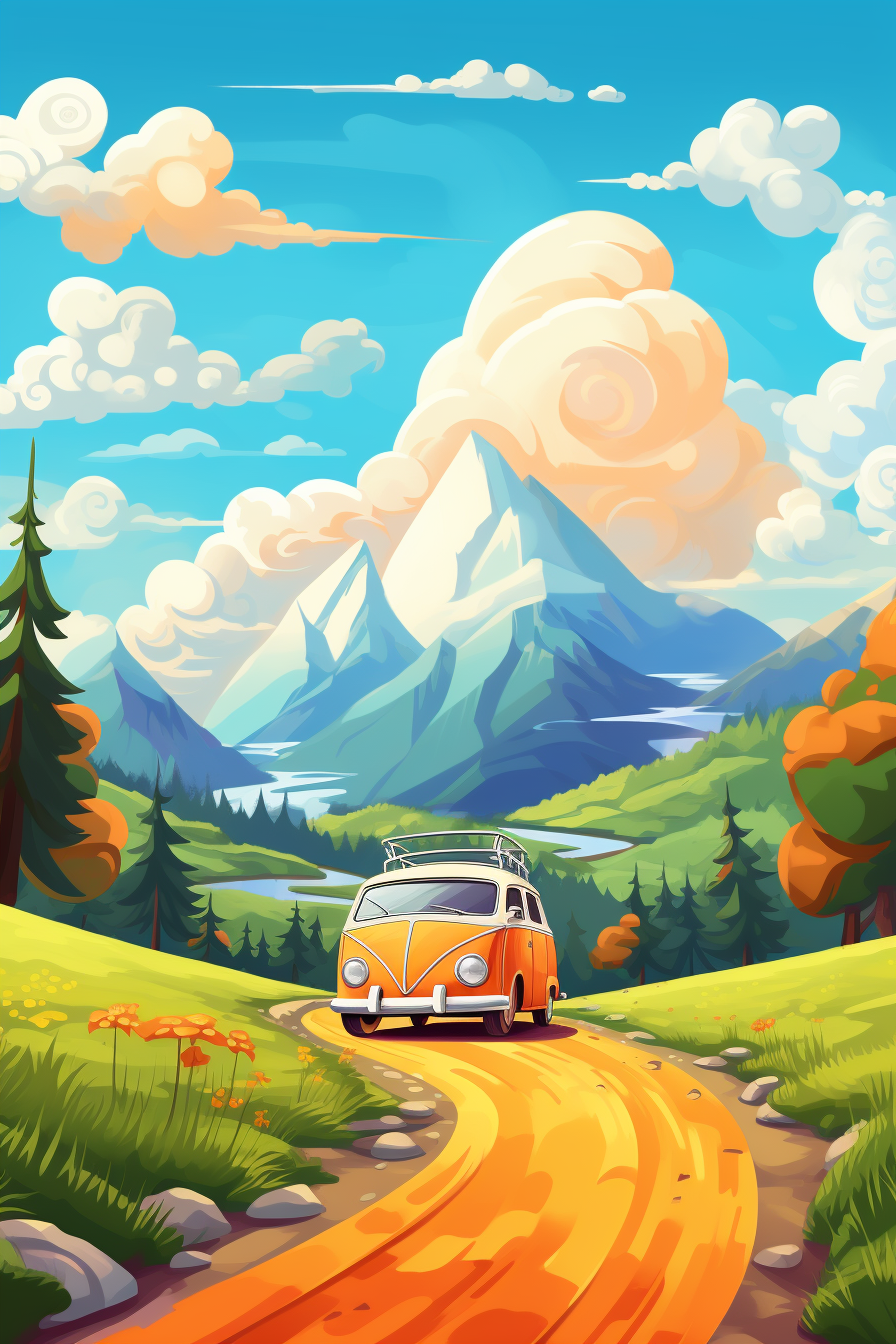 Obraz zachycuje krásnou krajinu s klikatou cestou a horou v pozadí. Modré nebe s bílými oblaky a zelená krajina s keři, stromy a trávou vytvářejí klidnou a mírumilovnou atmosféru. Oranžový Volkswagen van jede po cestě, což dodává obrazu pocit svobody a dobrodružství.