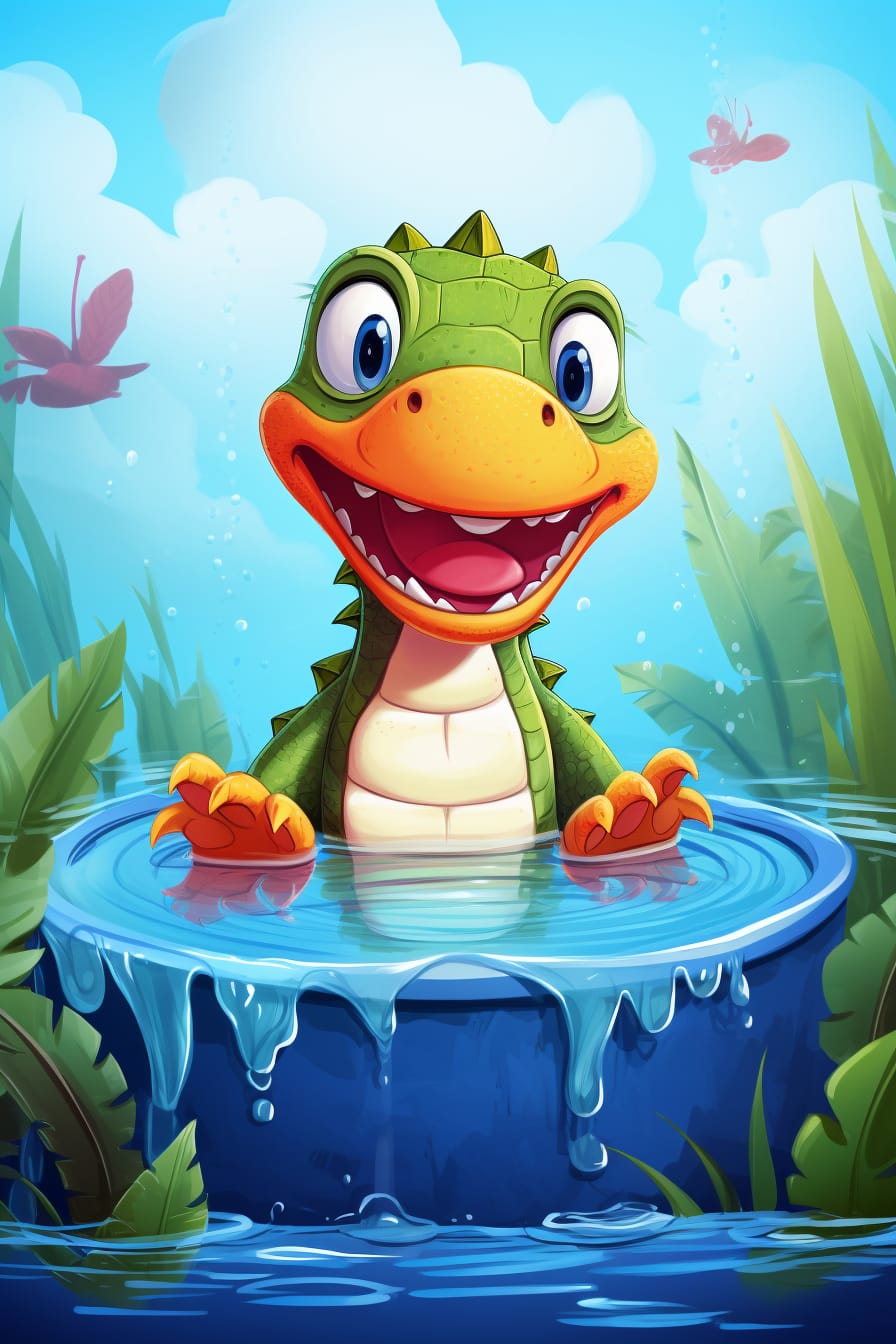 Na tomto kresleném obraze odpočívá roztomilý dráček, který si užívá chvíle klidu ve vodním bazénu. Modrá obloha a zelená tráva kolem bazénu vytvářejí krásný kontrast, který dodává scéně atmosféru radosti a odpočinku.