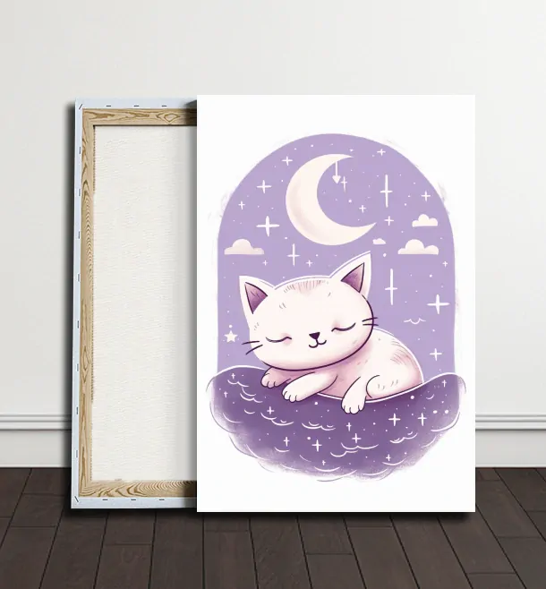 Klidná kočka se usadila na měkkém obláčku a sladce spí, zatímco v pozadí se vynořuje jasný měsíc, který osvětluje scénu s nádechem tajemství a klidného nočního prostředí.