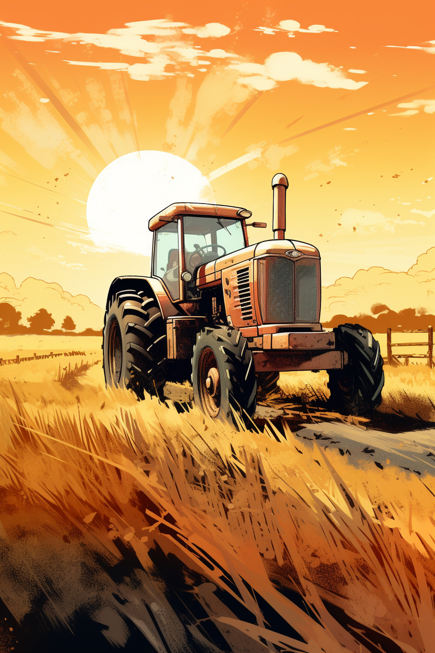 Tento obrázek zobrazuje traktor na poli při západu slunce. Traktor je oranžový a má velké černé pneumatiky. Traktor je uprostřed obrázku a směřuje k pravé straně obrázku. Pozadí je pole s vysokou trávou a stromy v dálce. Nebe je oranžové a žluté se sluncem zapadajícím v pozadí. Celková nálada obrázku je klidná a pokojná.