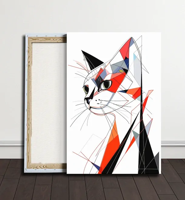 Abstraktní obraz s hravými tvary a barvami, které představují kočičí energii a radost z hraní.