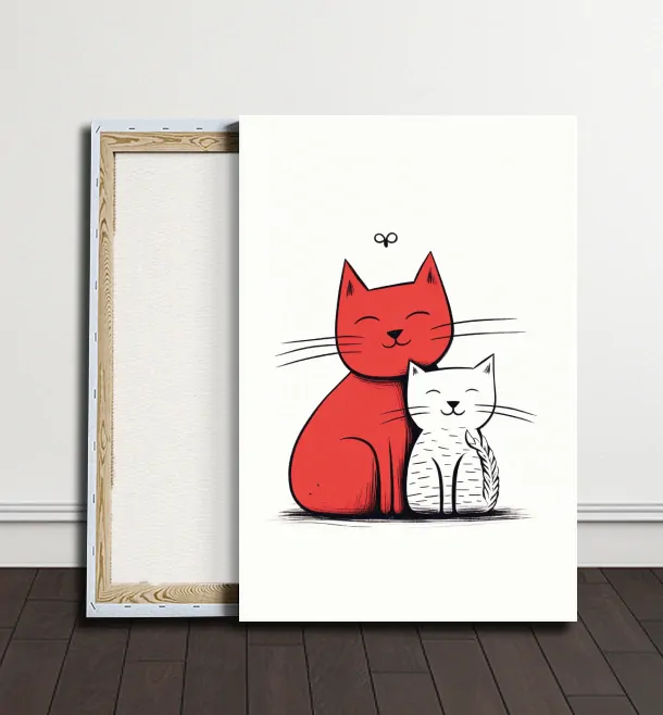 Tento obrázek je zobrazením dvou koček, jedné červené a jedné bílé, které spolu sedí se zavřenýma očima. Červená kočka je větší a sedí za bílou kočkou. Bílá kočka je menší a sedí před červenou kočkou. Obě kočky mají ocasek omotaný kolem těla. Červená kočka má nad hlavou malého motýla. Pozadí je bílé. Obrázek je proveden v jednoduchém, kresleném stylu. Tento obrázek je vhodný pro ty, kteří mají rádi klidné a relaxační ilustrace.