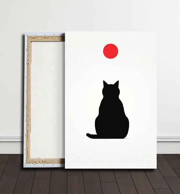 Tento minimalistický obrázek je zobrazením černé kočky, která se dívá na červenou kouli. Kočka sedí na bílém pozadí a je vidět z profilu. Červená koule je nad kočičí hlavou. Kočičí ocas je stočený kolem těla. Obrázek je jednoduchý a používá pouze tři barvy: černou, červenou a bílou. Tento obrázek je vhodný pro ty, kteří mají rádi kočky a minimalismus.