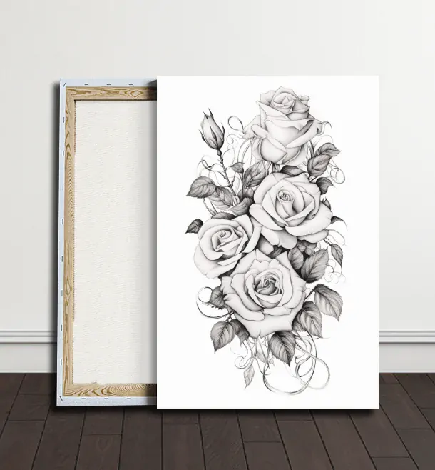 Černobílé růže na bílém pozadí tvoří kontrastní krásu, která okouzluje a provokuje. Jednoduchost barev zdůrazňuje krásu samotných květů, jako by vystupovaly ze zvýrazněného pozadí. Obraz přináší jedinečnou perspektivu na květinové umění, kde harmonie černobílých odstínů vyvolává vzácný estetický zážitek.