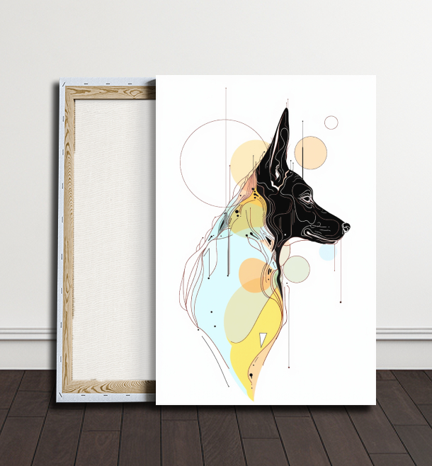 Abstraktní obraz zobrazuje černobílého psa jako centrální motiv. Pes vytváří výrazný kontrast mezi svou tmavou a světlou barvou, symbolizující duality a protiklady. Jeho postava je dynamická a plná pohybu, což naznačuje energii a vitalitu, zatímco prostředí kolem něj je abstraktní a chaotické, vyjadřující neuchopitelnou povahu lidských emocí. Pes, pejsek.
