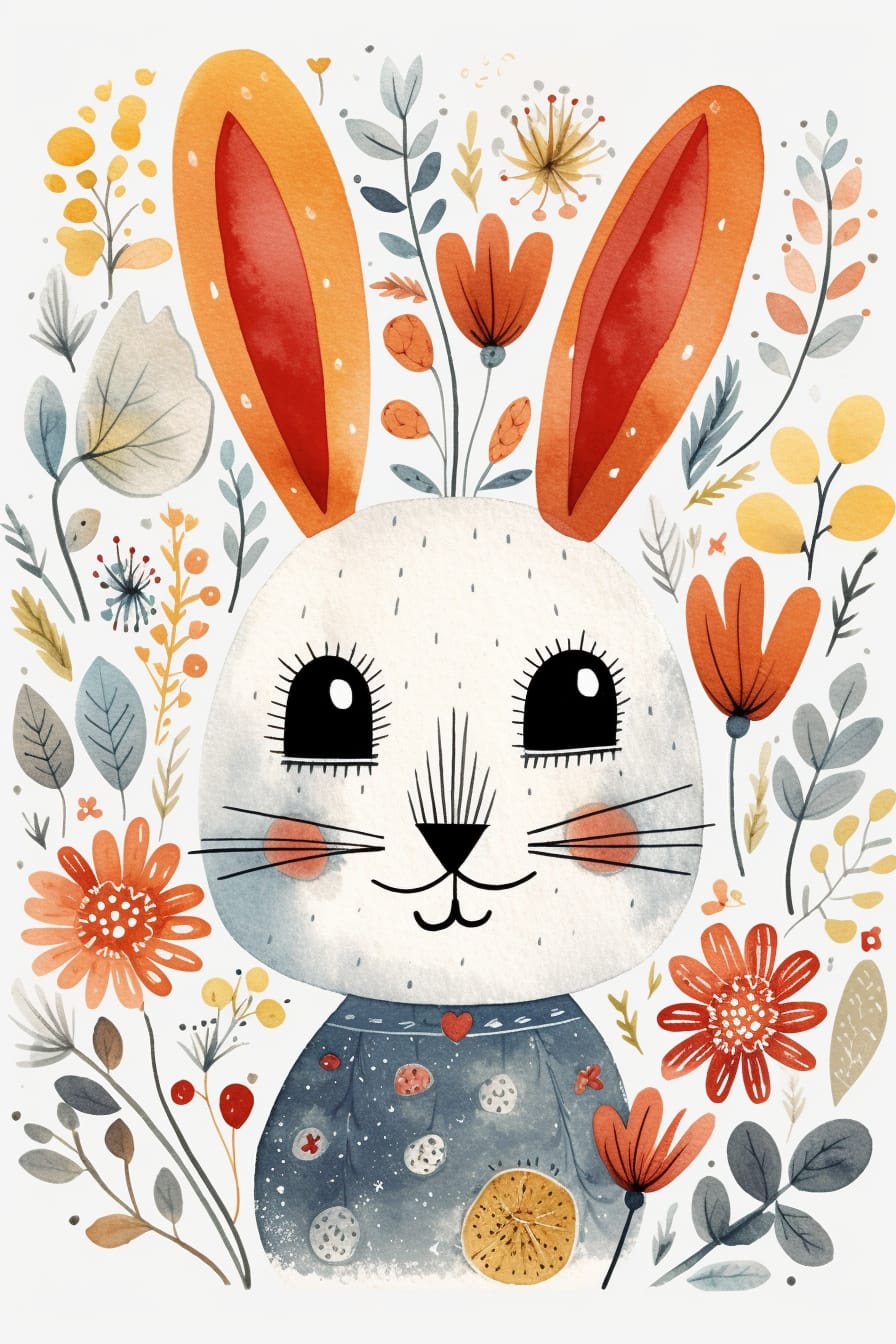 V tomto rozkošném kresleném obraze upoutá pozornost velká hlava králíka, která je obklopená květinami. Vytváří se tak dojem králíkovy zahrady snů, kde se kontrastuje králíkova něha s barevným rozkvetem přírody.