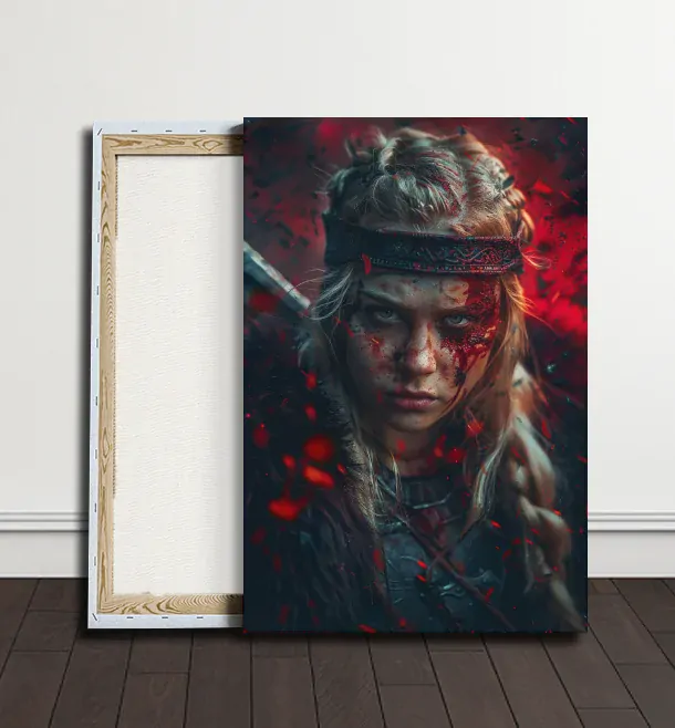 Krvavá vikingská bojovnice, omývaná rudými vlnami boje, představuje symbol odvahy a obětavosti ve vikingském světě. Její odhodlání a hrdinství jsou vyjádřeny každou kapkou krve, což ji činí nezapomenutelnou postavou v boji za svobodu a čest.