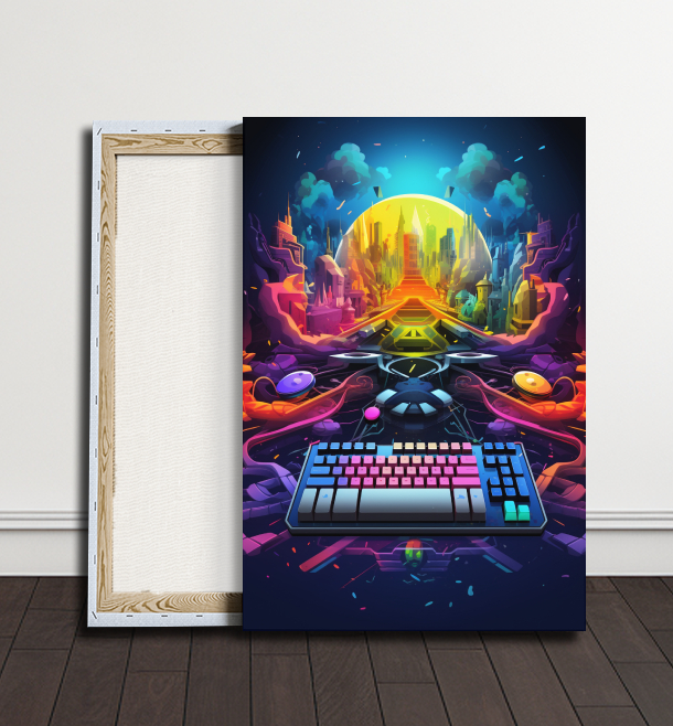 Ponořte se do světa, kde se technologie a fantazie setkávají. Tento obraz zobrazuje klávesnici, která je bránou do neonově osvětleného města budoucnosti. Ideální pro milovníky sci-fi a moderního designu.