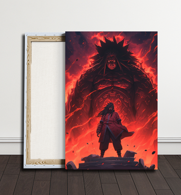 Madara Uchiha, mistr boje a geniální taktik, je zachycen jako vládce vlastního osudu. Jeho oči září plameny nesmírné síly, zatímco v pozadí se vlní symboly Sharinganu, ukazující na jeho nekonečnou moc a rozhodnutí ovládnout svět.