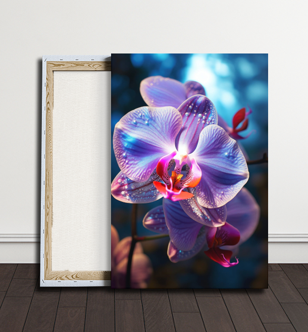 Fialový květ tancuje na obraze, jeho okvětní plátky se proměňují v nádech modré barvy, což vytváří úchvatný kontrast. Obraz přináší dojem lehkosti a elegance, kdy se fialová a modrá propojují v jedinečném tanečku květu na plátně.
