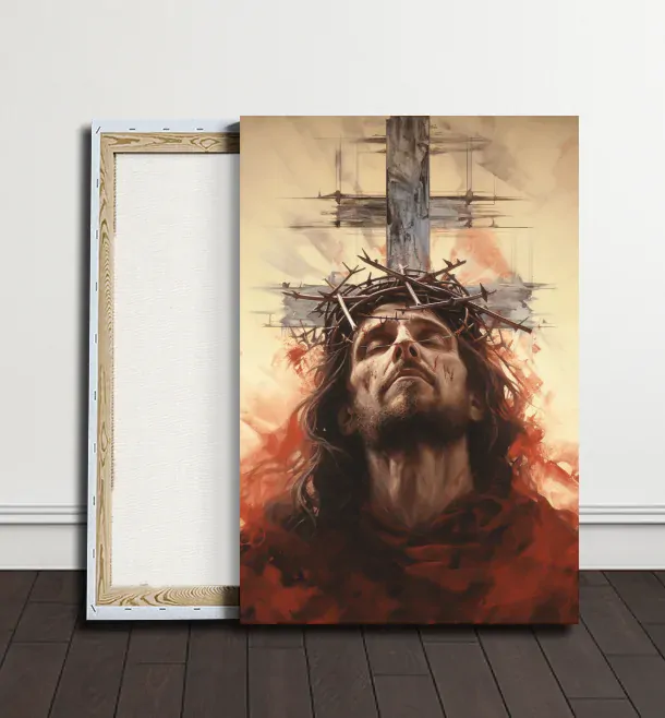 Na obraze je zobrazen Ježíš, který nese kříž na svých bedrech, připravený obětovat se pro záchranu lidstva. Jeho tvář vyzařuje soucit a statečnost. Kříž v pozadí symbolizuje břemeno a oběť. Obraz přináší pocit úcty a pokory vůči jeho lásce a obětavosti.