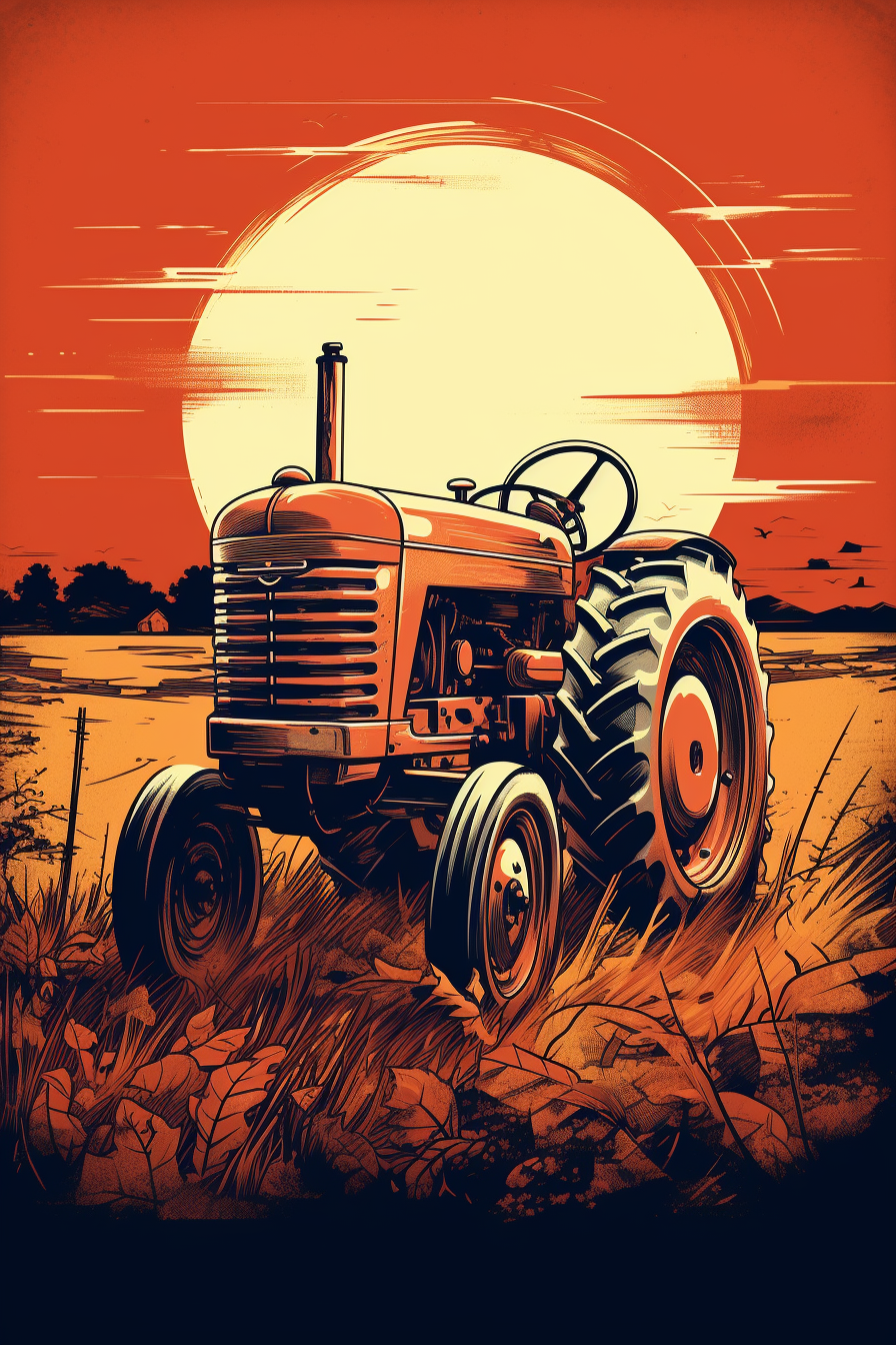 Tento obrázek zobrazuje červený traktor na poli s velkým oranžovým sluncem v pozadí. Traktor je staromódní model s velkými koly a volantem. Traktor je uprostřed obrázku se sluncem za ním. Pozadí je pole s vysokou trávou a několika stromy. Barevná paleta je převážně oranžová a červená, s několika černými a bílými detaily. Ilustrace má vintage nebo retro pocit.