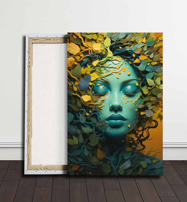 V této surrealistické kompozici se obličej ženy proměňuje v živoucí zahradu podzimního listí, kde se barevné lístky rozpínají a šeptají tajemné příběhy zasněných sezón.