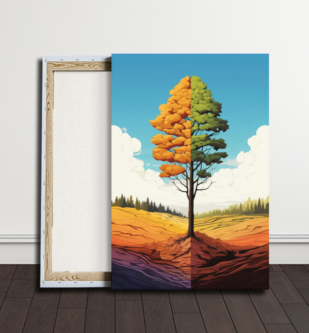 Strom ve středu obrazu předvádí kontrastní podívanou, kdy polovina jeho koruny se zbarvila do podzimních odstínů, zatímco druhá polovina zůstává věrná živé zeleni léta. Tento obraz symbolizuje proměnu přírody.