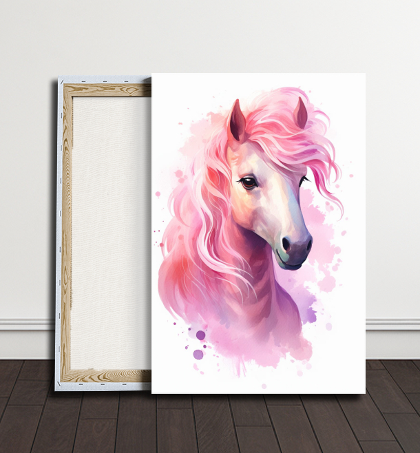 V kouzelném obraze se objevuje kreslený kůň s jemnou růžovou hřívou, kontrastující s čistotou bílého pozadí. Krása tohoto momentu zachycuje jedinečný okamžik, kdy se síla a něha propojují v nebeském tanci koně na prázdném plátně.