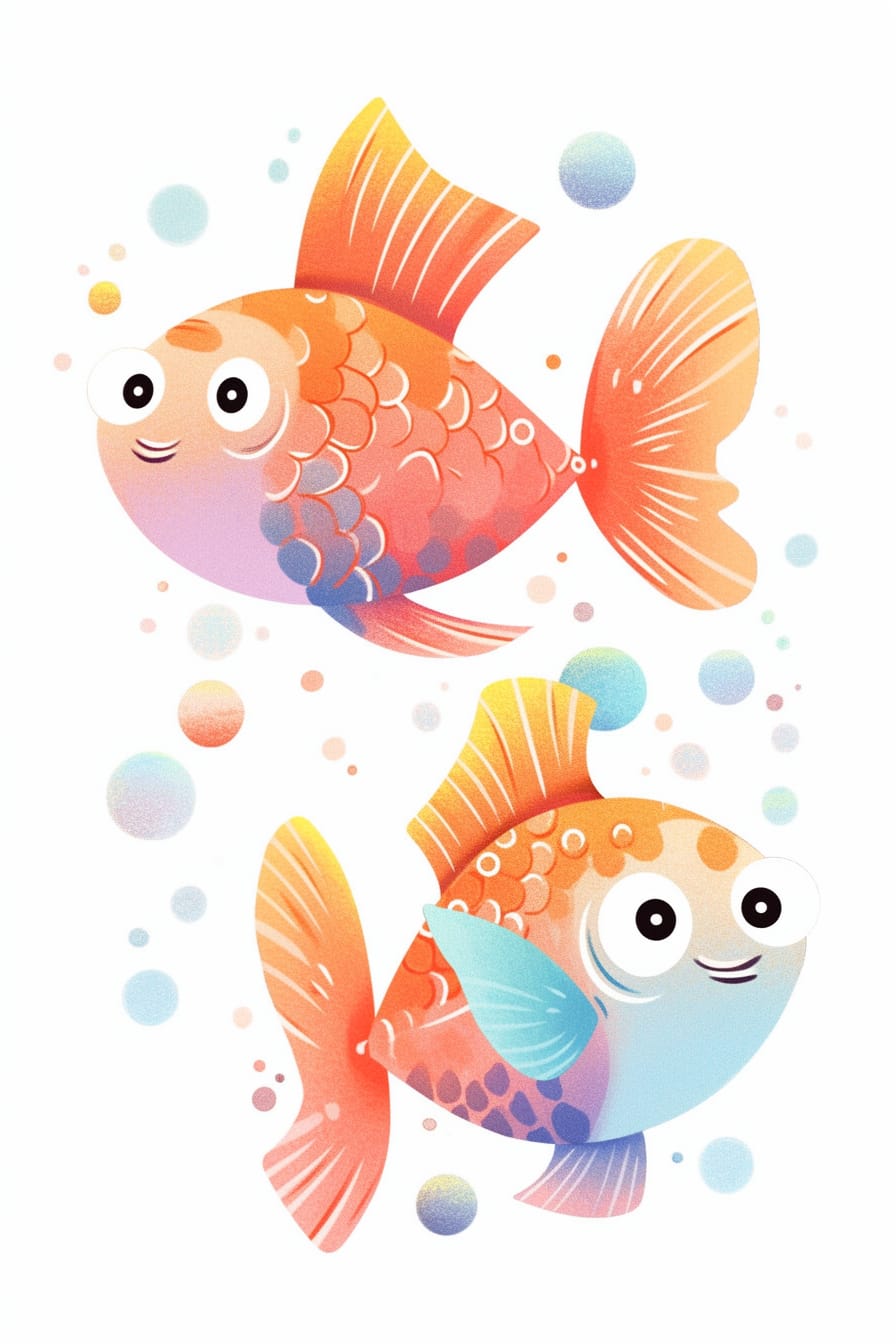 Dvě malé rybičky plují lehce ve vodě, obklopené hravými bublinami, které se rozplývají ve vzduchu a tvoří pohádkovou atmosféru radosti a svobody.