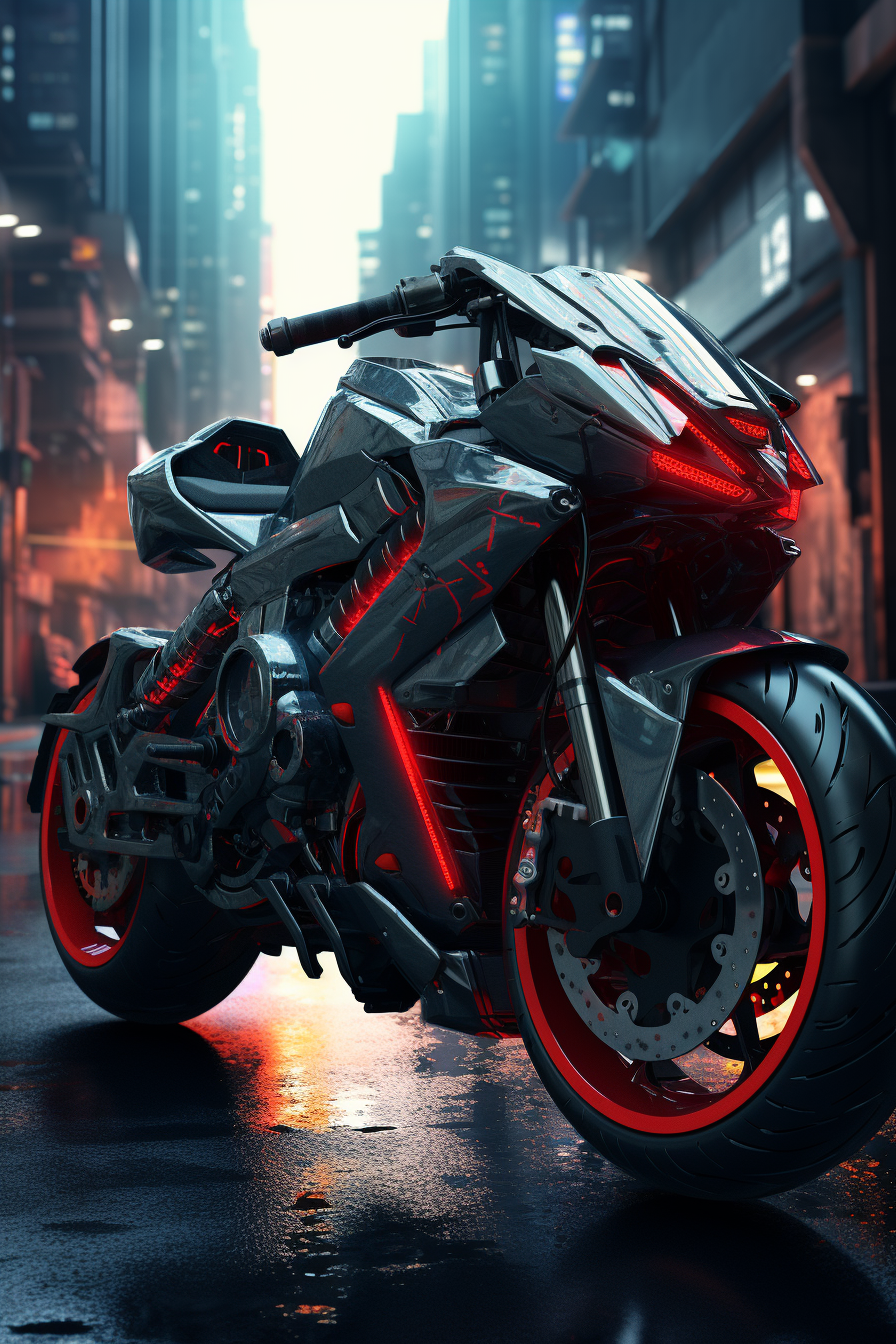 Vítr vlasů a adrenalin v žilách - moderní černá motorka jezdí nekompromisní rychlostí po futuristickém městě. Jediná věc, která září víc než městská architektura, je světlo v jejich světlech.