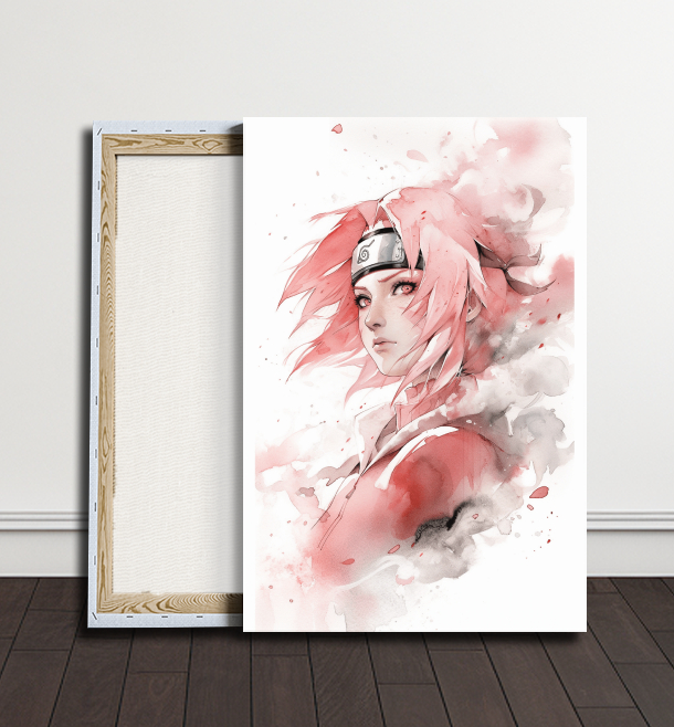 Sakura Haruno drží pózu se sebevědomím a klidem. Je obklopena květinami, které zdůrazňují její ženskost a sílu. Její oči září jistotou a odhodláním. Naruto