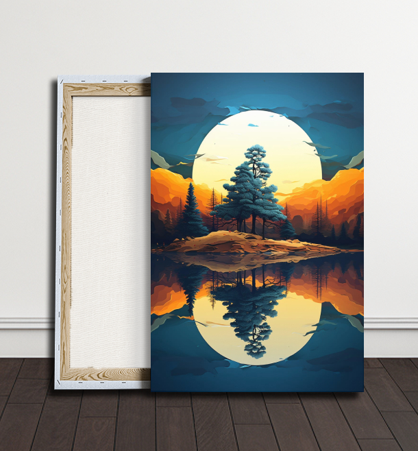 V magickém obraze se slunce kloní k západu, zanechávajíc za sebou zlaté paprsky, které rozjasňují oblohu nad velkým stromem a jeho zrcadlením v klidném rybníku.