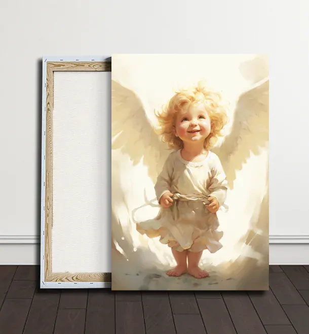 Tento obraz zachycuje podobu malého anděla s roztaženými křídly, osvíceného jemným světlem. Anděl drží v rukou větev, symbol míru a harmonie. Toto dílo přináší do každého prostoru klid a nadčasovou krásu.