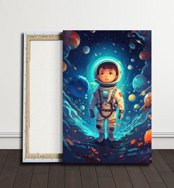 Astronaut odhaluje tajemství vesmíru, v blízkosti měsíce jako zázračného průvodce. Jeho oči odleskují hvězdné nápady a nekonečná dálka ho láká k dalším objevům. Obraz vyvolává pocit zvědavosti a fascinace nad neznámými hranicemi vesmíru.