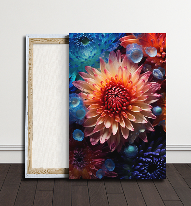 V nádherném obraze se setkávají dva velké květy - jeden svěže červený a druhý modrý jako nebe. Jejich okvětní plátky tvoří jakousi taneční podívanou, kdy se zdá, že květy tančí pod vodou v dokonalém souladu barev a krásy přírody.