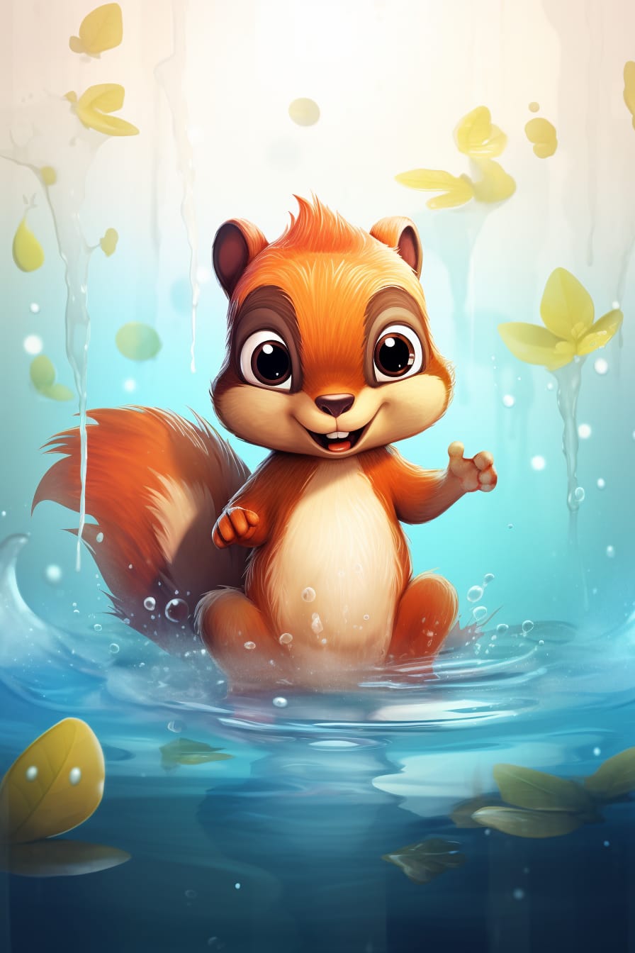 Na tomto půvabném kresleném obraze je vyobrazena šťastná veverka, která se usmívá a sedí na břehu. Její radostný pohled a roztomilá postava přinášejí dojem veselí a hravosti, kdy si veverka užívá okamžiky klidu a radosti v harmonii s přírodou.
