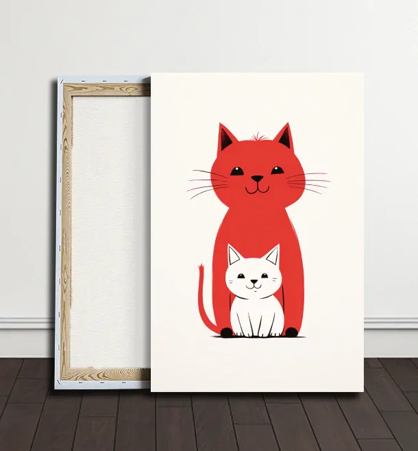 Tento digitální obrázek je zobrazením dvou koček, jedné velké a jedné malé, na bílém pozadí. Větší kočka je červená a stojí na zadních nohách se stočeným ocasem. Menší kočka je bílá a sedí před větší kočkou. Obě kočky mají jednoduchý, kreslený design s černými obrysy a fousy. Větší kočka má na tváři velký úsměv, zatímco menší kočka má menší úsměv. Tento obrázek je vhodný pro ty, kteří mají rádi veselé a přátelské ilustrace.