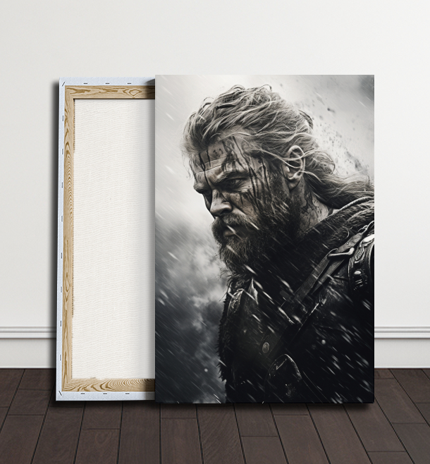 Obraz zachycuje velkého vikinga, oblečeného ve zbroji, který odolává návalu bouře s nezlomnou odvahou. Jeho silueta proti rozbouřenému moři a temnému nebi zdůrazňuje jeho statečnost a sílu. Obraz vyvolává pocit síly a hrdinství, kterým vikingové prosluli jako bojovníci.