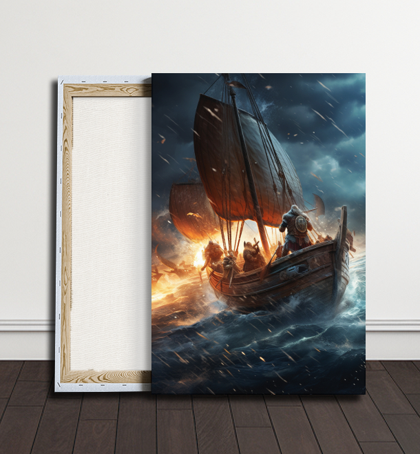 Vikingská loď s velkou plachtou se statečně vznáší nad rozbouřeným mořem. Její posádka projevuje nezlomnou odvahu a vytrvalost v tváři nástrah přírodních živlů. Obraz vyvolává dojem dobrodružství a statečnosti, kterou vikingští námořníci přinášeli na každé své cestě.