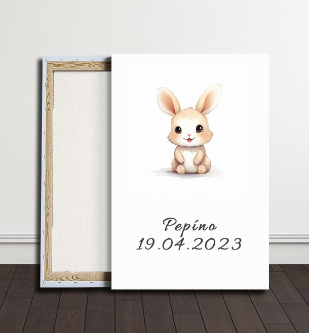 Osobní dotek umění! Objednejte si tento roztomilý obraz zajíčka a přidejte vlastní text, jméno nebo datum, aby byl jedinečným a osobním dárkem nebo dekorací.