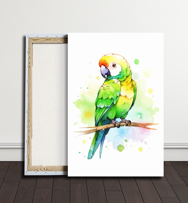 V této rozkošné dětské malbě usedá zelený papoušek s veselým výrazem na větvi stromu. Jeho zářivé zbarvení a radostná postava přivádí úsměv na tváře a vytváří magický svět plný přátelství s přírodou.