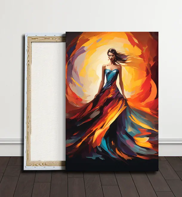 Tento digitální obraz je dílem talentovaného umělce, který dokáže vytvořit nádherné barevné kompozice. Obraz zachycuje ženu v pohyblivých šatech, které vytvářejí dojem ohně a vody. Pozadí je oranžové a žluté, což evokuje atmosféru západu slunce nebo východu slunce. Tento obraz je ideální pro ty, kteří hledají něco jedinečného a dynamického pro svůj domov nebo kancelář.