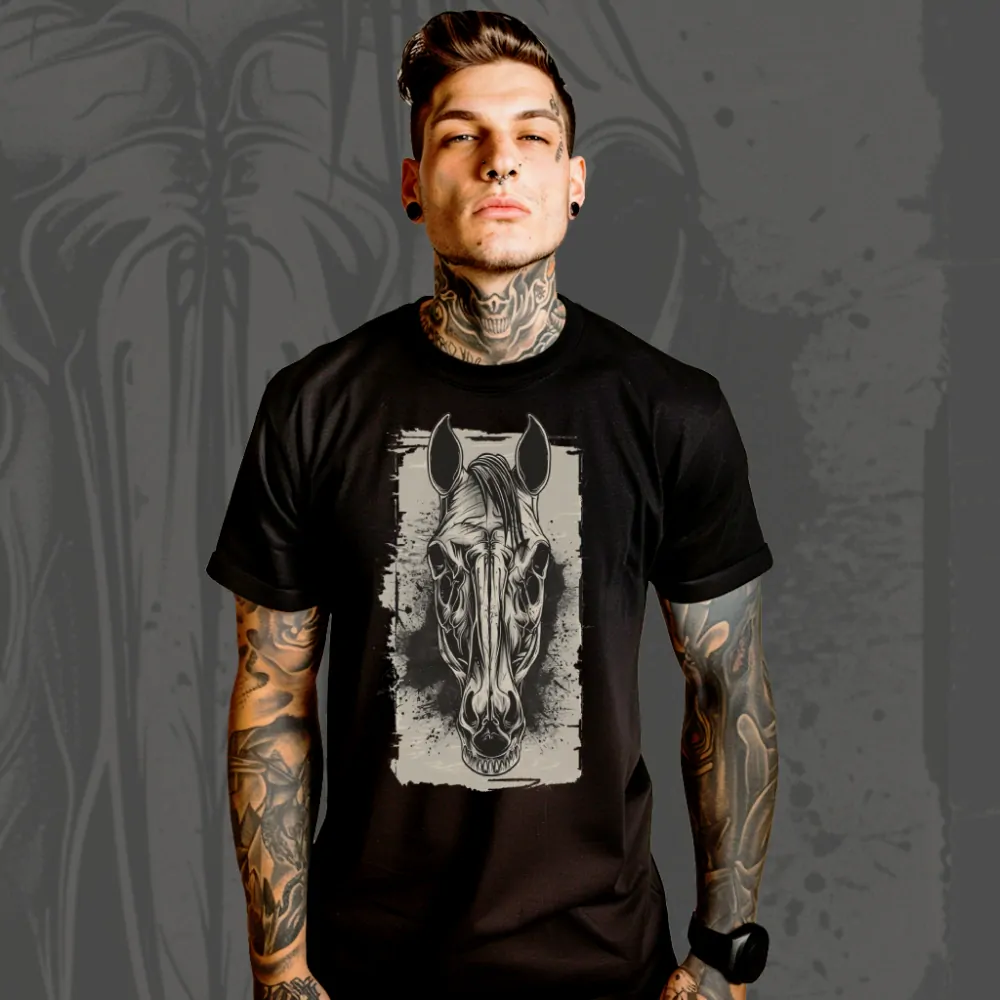 Zamilujte se do této symfonie hrůzy a mystiky s tričkem Dark Horse Skeleton. Představte si osedlaného koně ze záhrobí, jehož kostra pulzuje energií z temných rohů podsvětí a jehož oči svítí jako ohnivé uhlíky v nočním šeru. Temný kůň na vašem tričku. Výrazná lebka koně vytváří temný a mystický motiv inspirovaný symbolikou smrt a divokou silou přírody. Tento design spojuje motiv kůň, lebka a temná atmosféra, která připomíná legendy o duchu koně a pomíjivosti života.