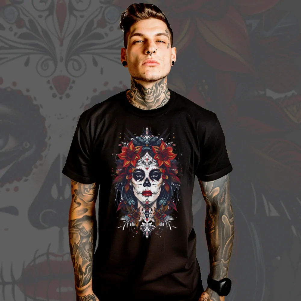 Ve stínu mexických ulic se zjevuje El Muerte, strážce hranic mezi životem a smrtí. Toto tričko je klíčem do světa, kde se setkávají oslavy a smutek, krása a destrukce. Oblečte se do této zbroje smrti a připravte se na cestu s El Muerte, který tančí mezi světy a nese s sebou poselství o přirozenosti proměny a cyklu života. Lebka, kostra nebo makeup?